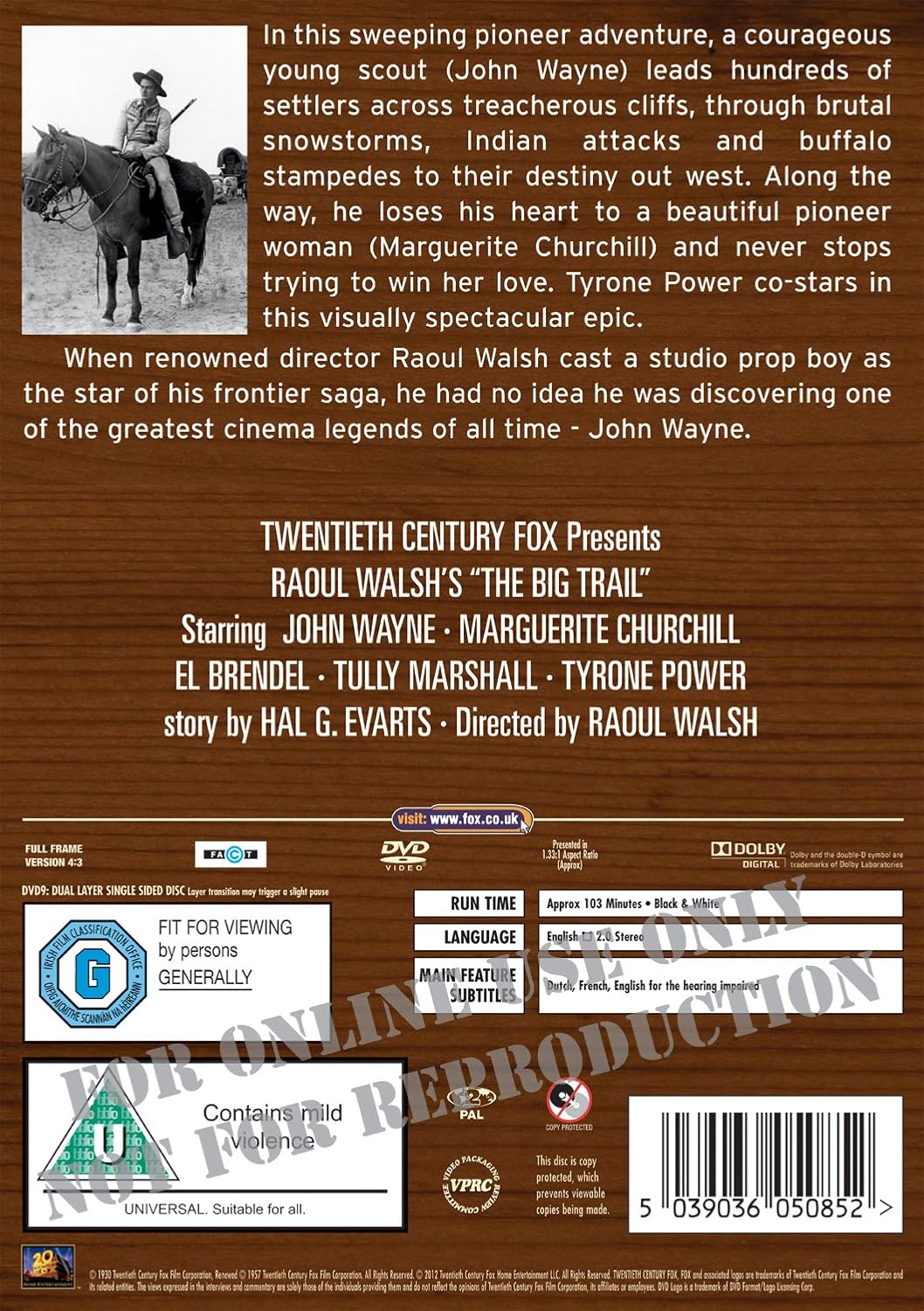 When renowned director Raoul Walsh cast a studio prop boy[, stunt man and bit-part player] as the star of this sweeping pioneer adventure, he had no idea he was discovering one of the great cinema legends of all time – John Wayne. The Big Trail chronicles the journey of hundreds of settlers in covered wagons from the Mississippi river to their destiny out west.